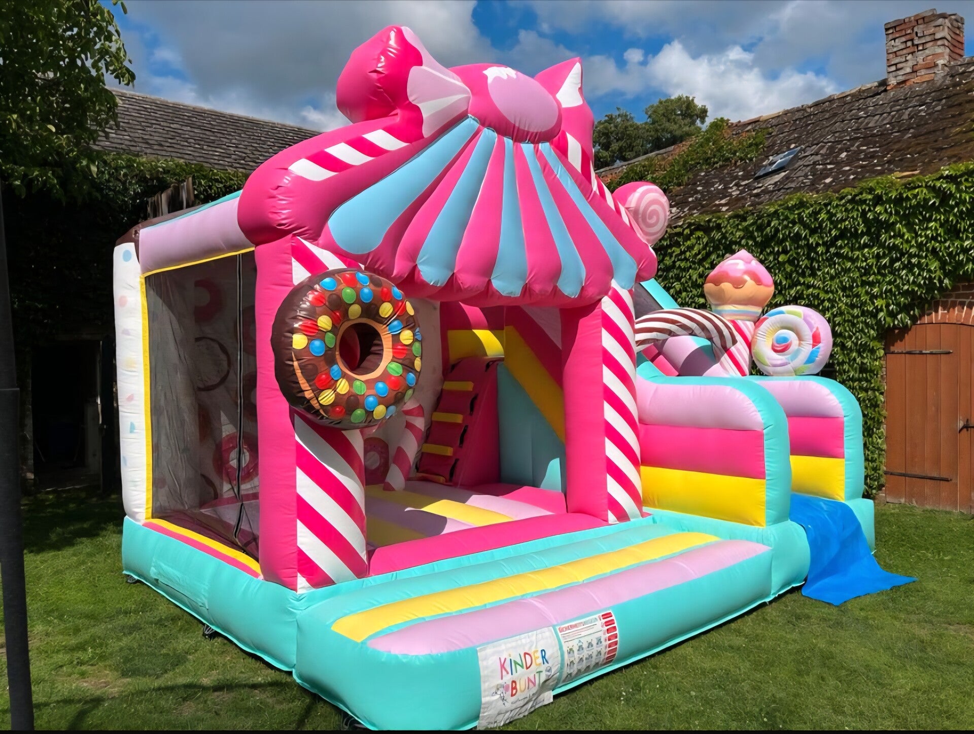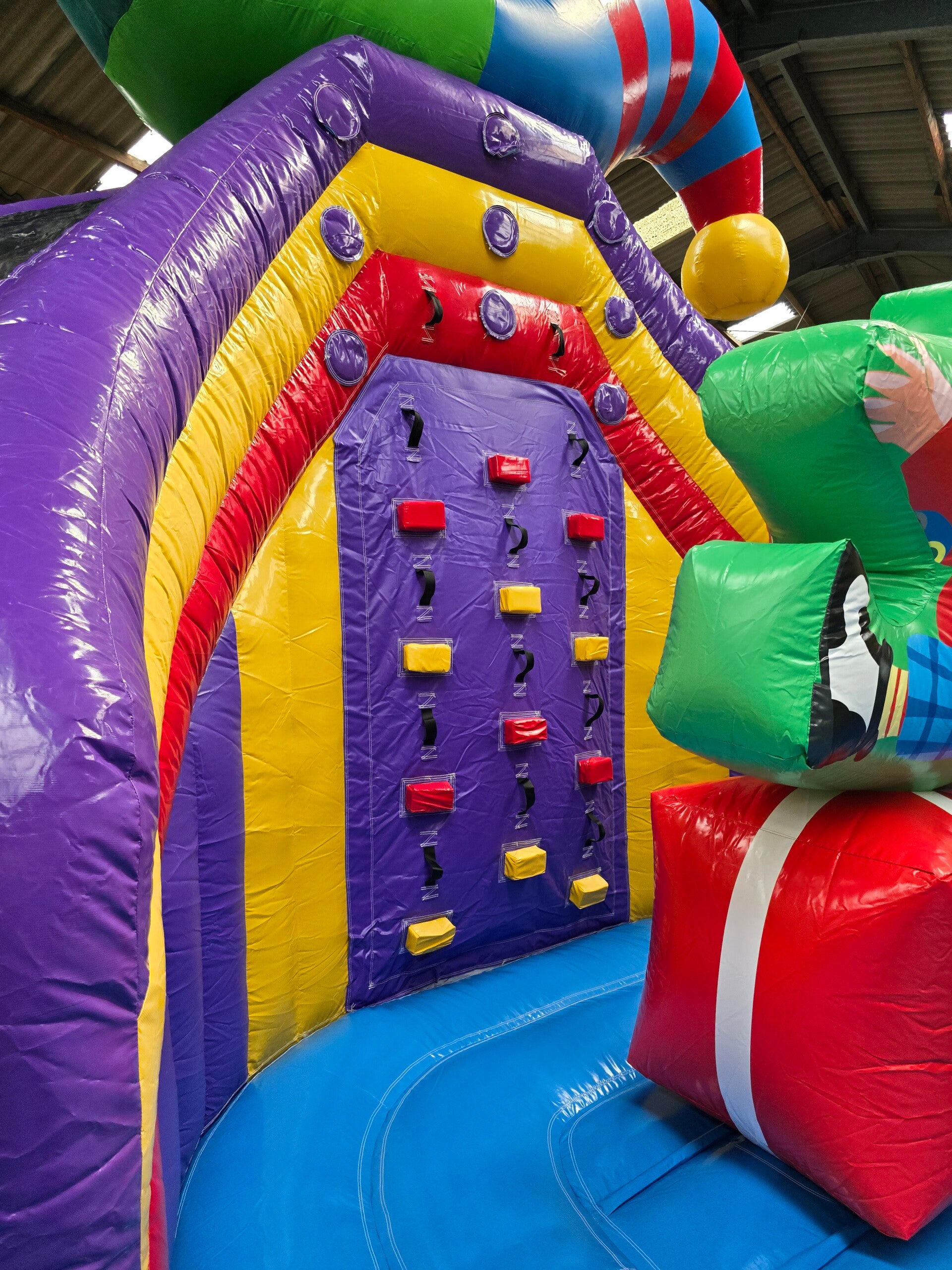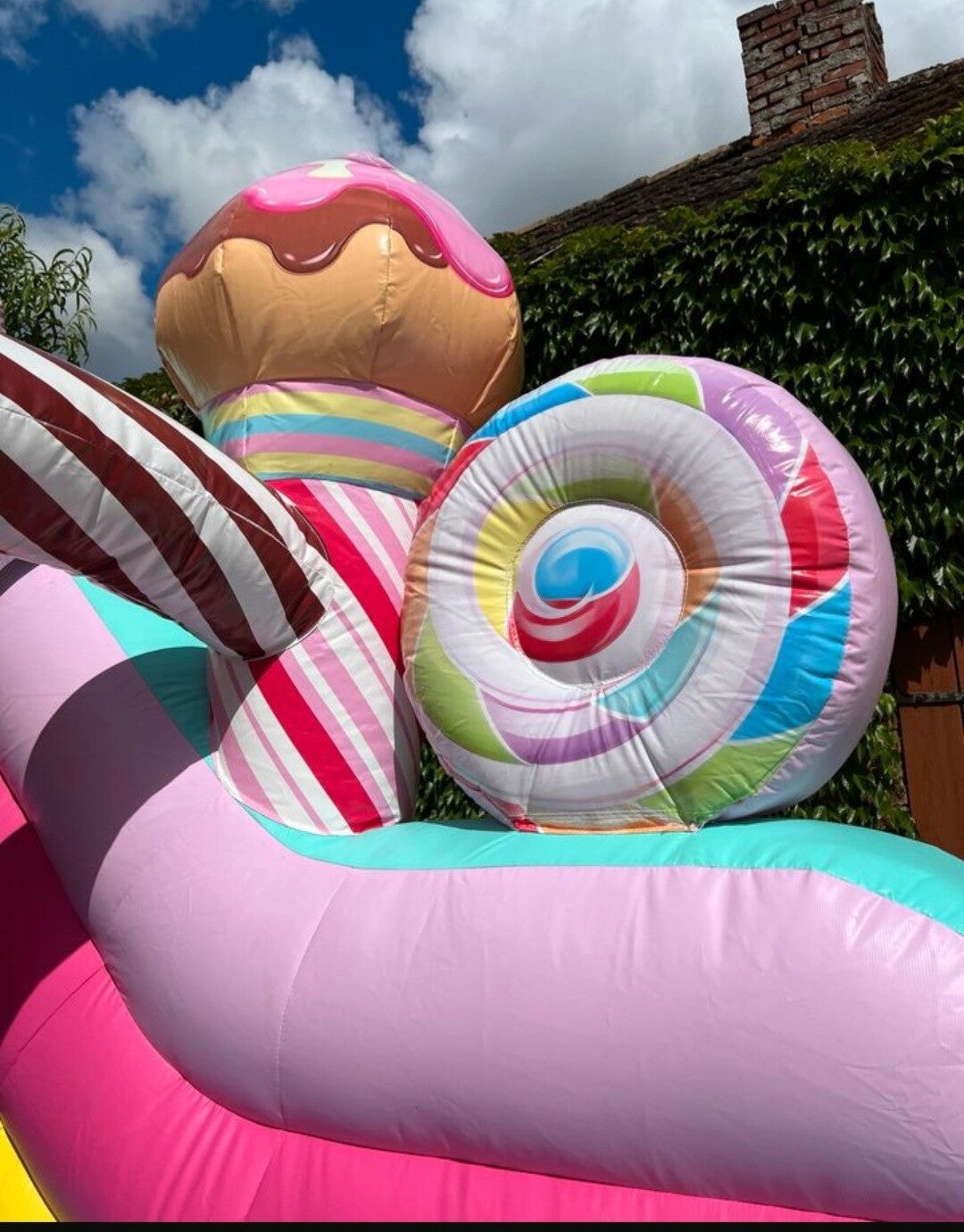 Willkommen in einer zauberhaften Welt voller Bonbons und Zuckerstangen! Diese farbenfrohe Hüpfburg lässt Kinderträume wahr werden. Sie bietet mit ihrer tollen Rutsche und einer verspielten Kulisse jede Menge Action und Freude – stundenlanger Spaß garantiert!