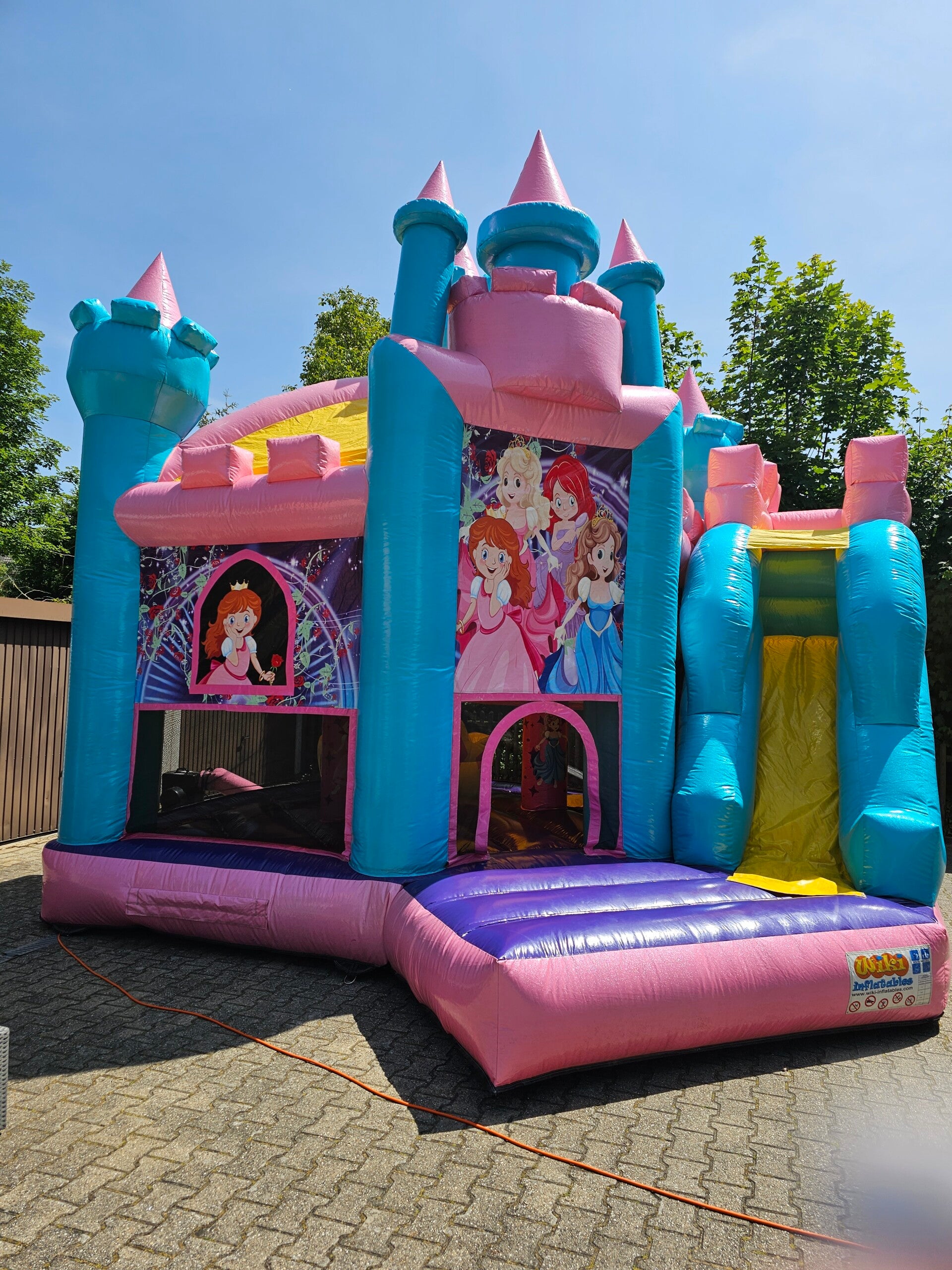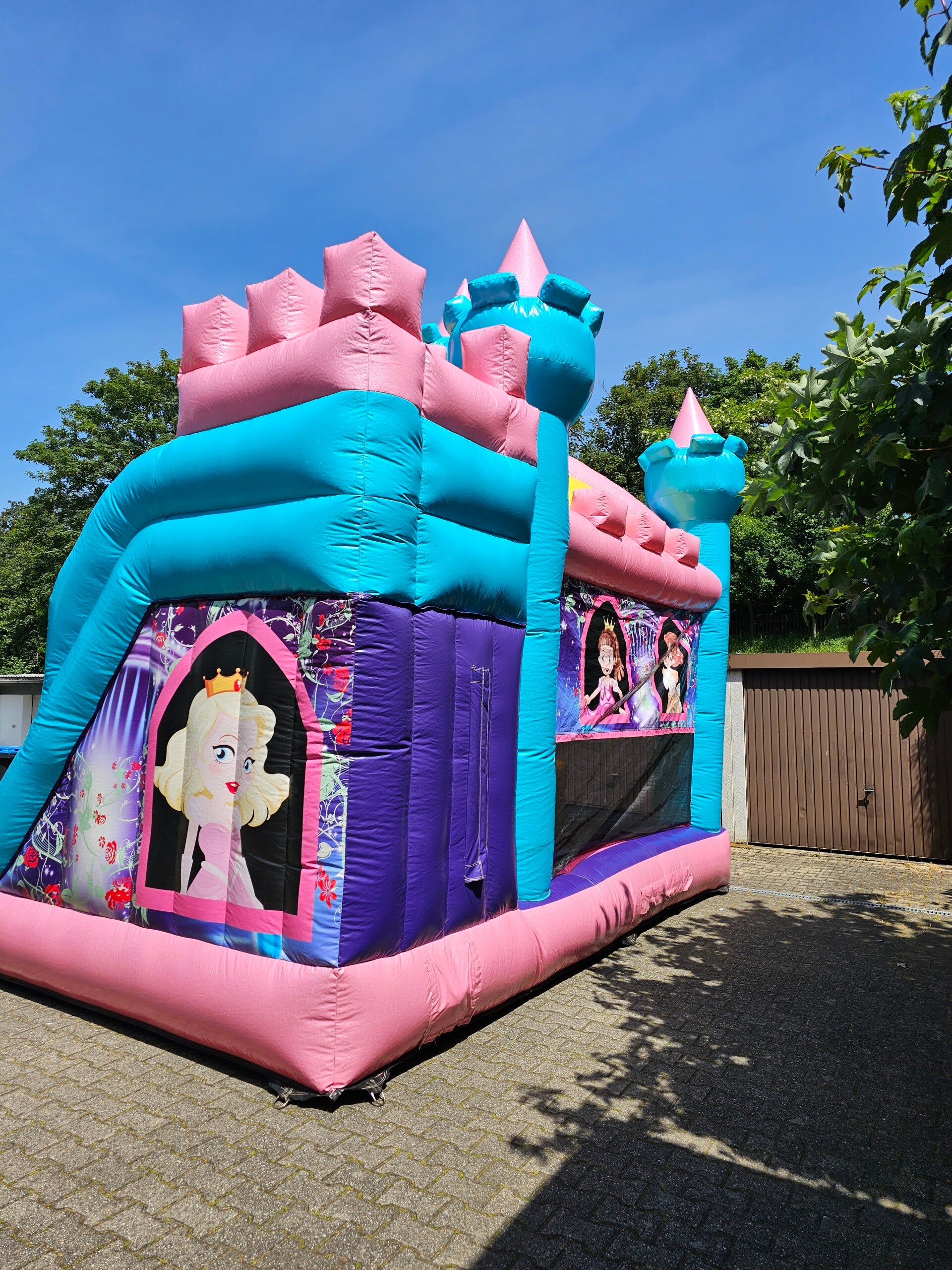 Unser glitzerndes Schloss ist ein wahr gewordener Traum, der Kinderherzen höher schlagen lässt. Im Inneren erwartet die kleinen Gäste eine großzügige Sprungfläche mit spannenden Hindernissen – ideal zum Toben und Spielen. An der Seite sorgt eine Rutsche für zusätzlichen Spaß und Action.
