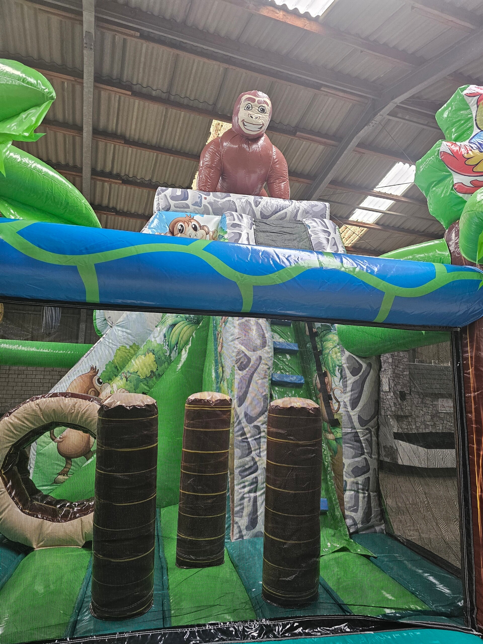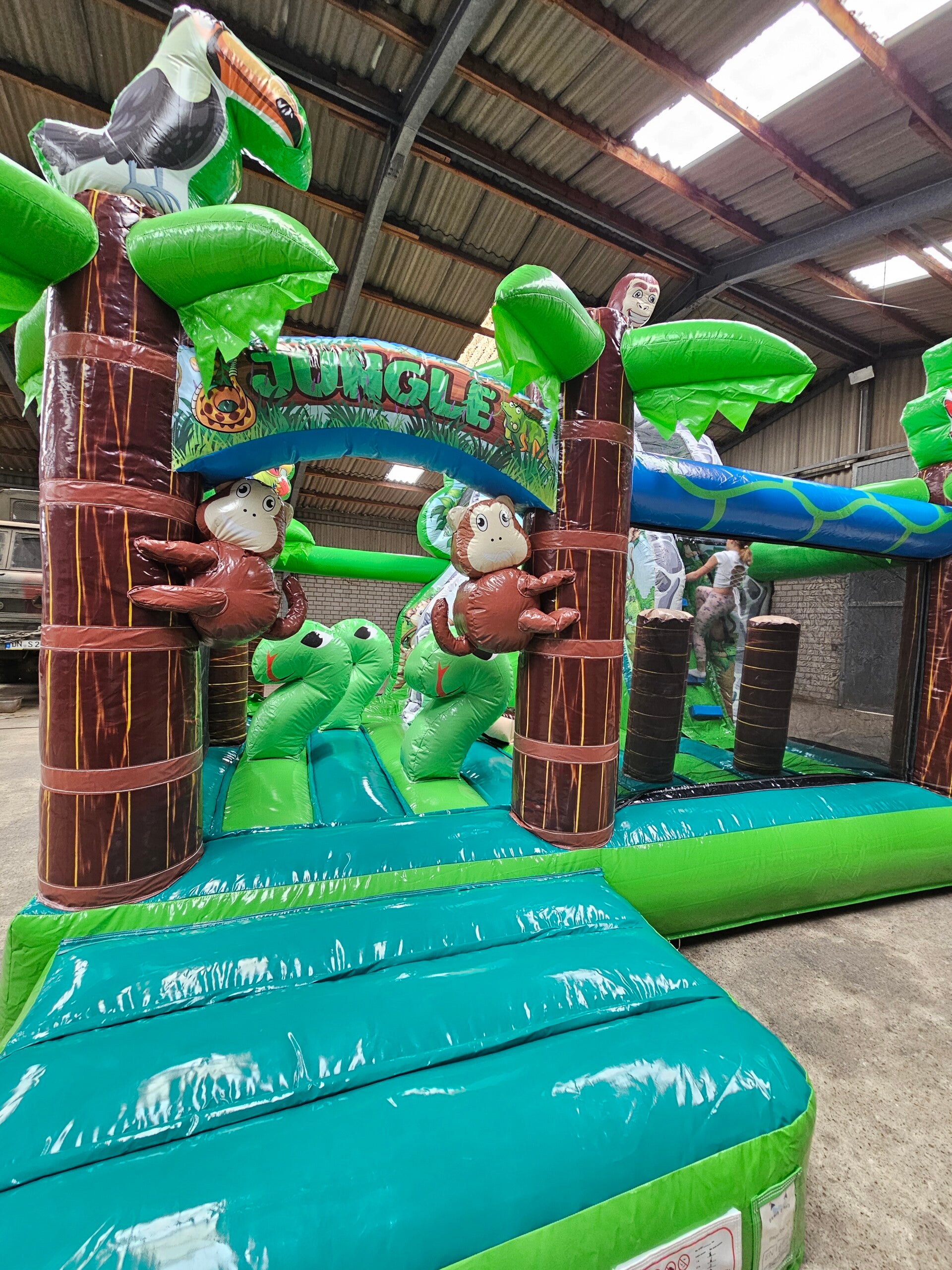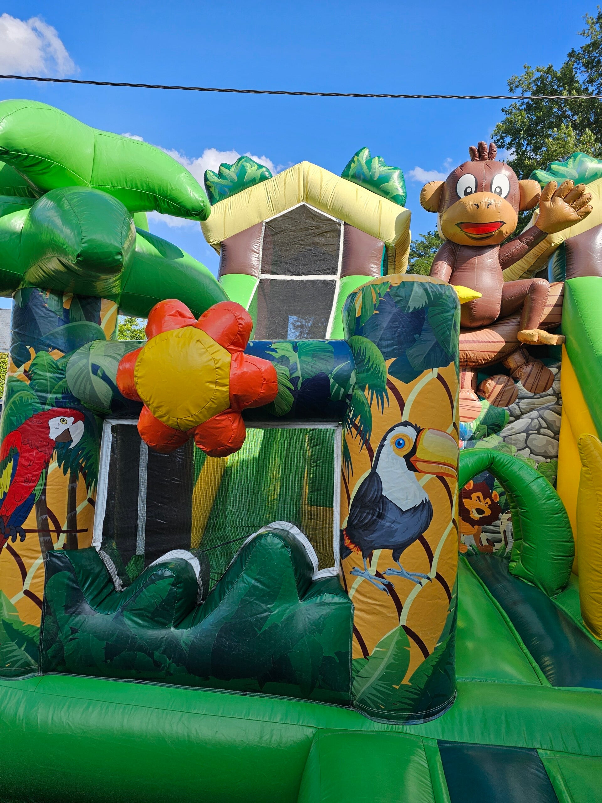 Entdecken Sie unsere tropische Dschungel-Hüpfburg – das Highlight für jede Veranstaltung! Im farbenfrohen Dschungel-Design bietet sie Kindern eine sichere Umgebung zum Springen, Rutschen und ausgelassenen Spielen. Hier ist stundenlanger Spaß garantiert!