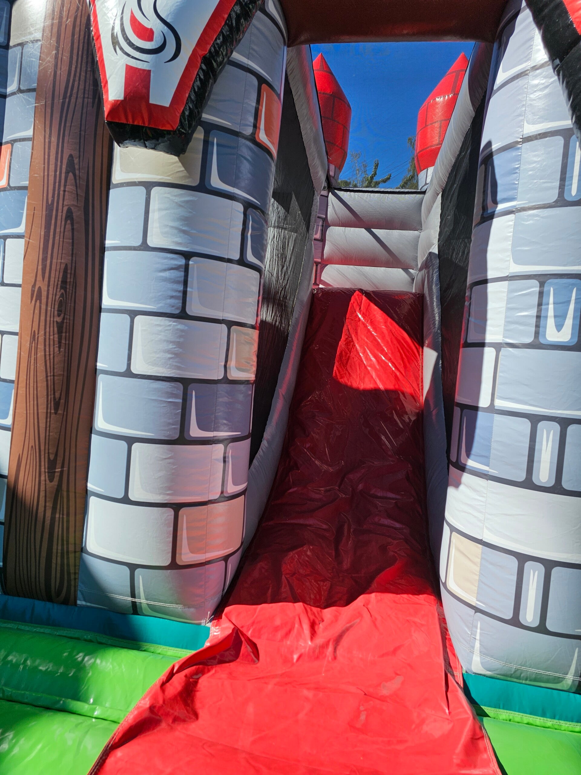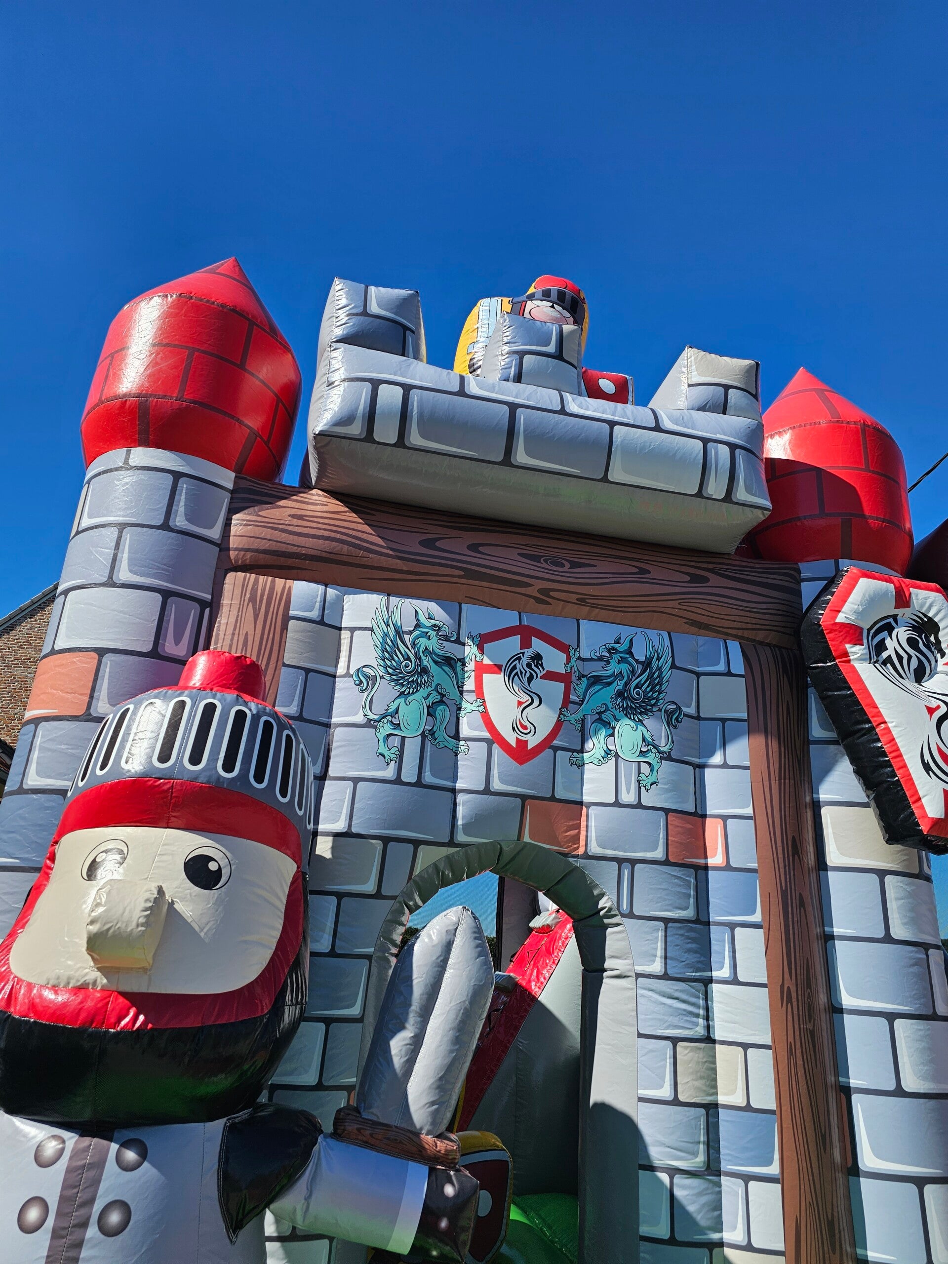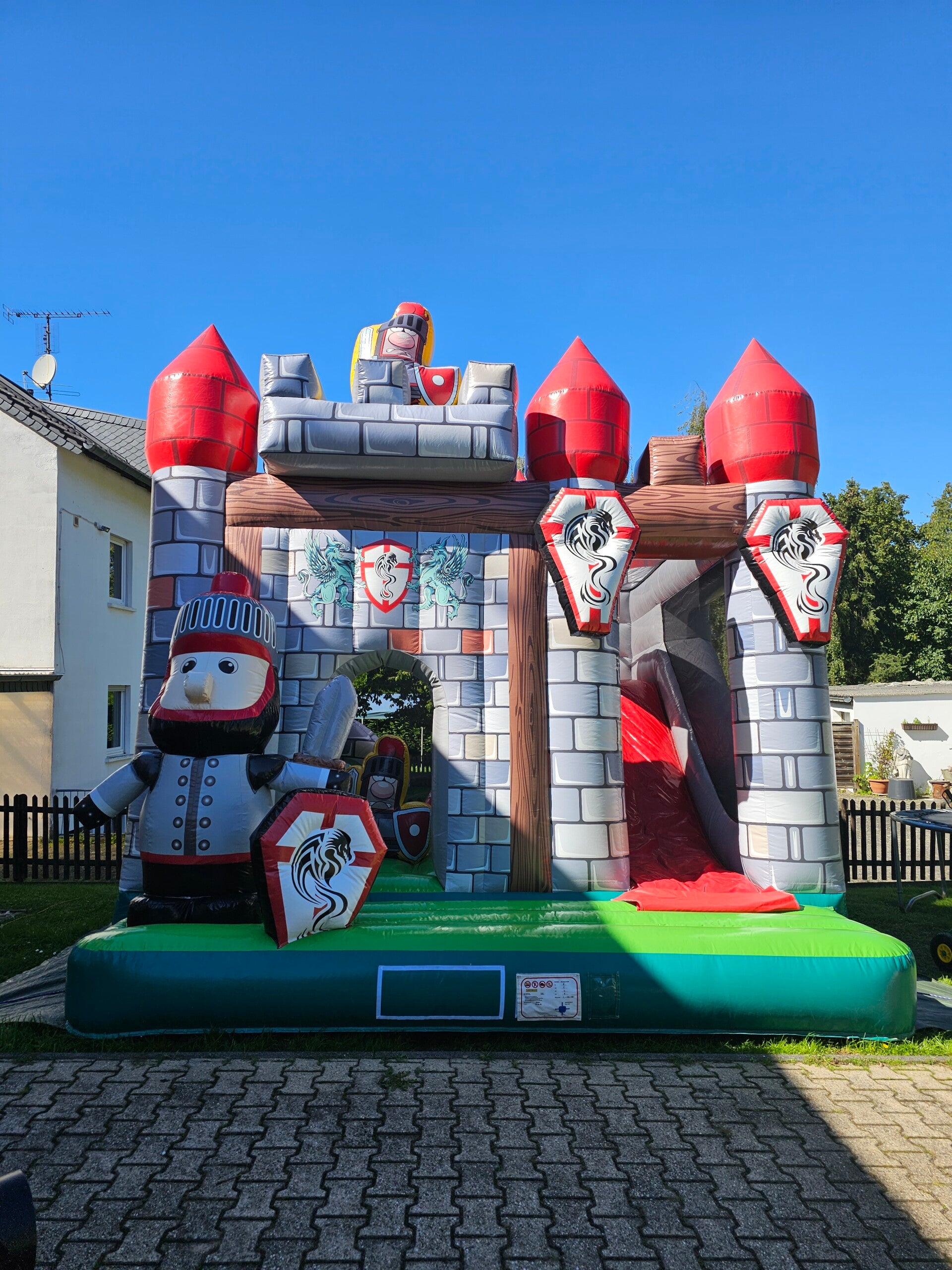 Diese großzügige Hüpfburg lädt kleine Ritter und Prinzessinnen zu einem aufregenden Abenteuer ein. Mit einer spannenden Sprungfläche, die diverse Hindernisse bietet, und einer seitlichen Rutsche wird der Spielspaß noch größer. Die beeindruckenden 3D-Elemente setzen das Ritterburg-Thema perfekt in Szene und machen die Burg zu einem echten Hingucker.