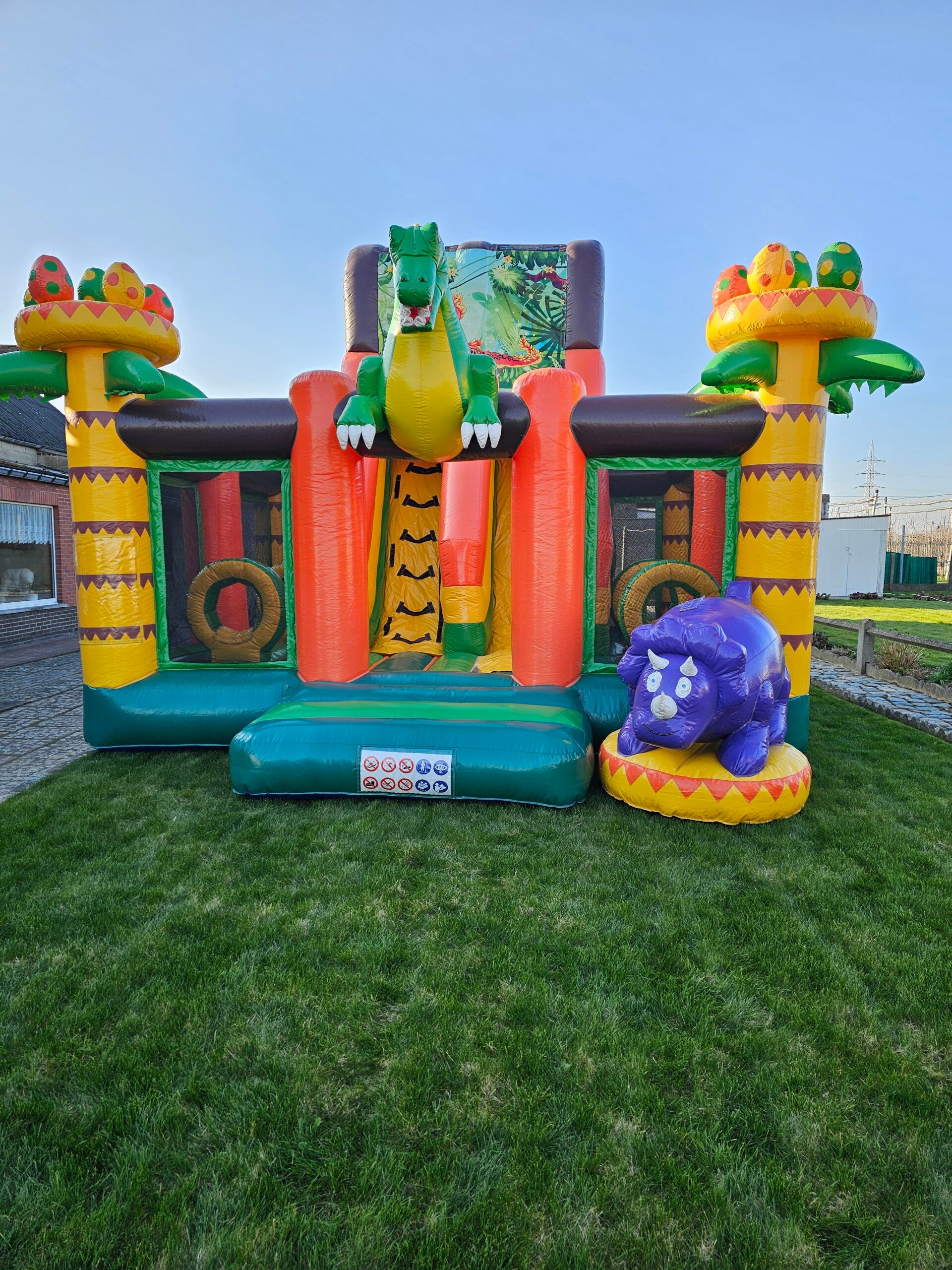 Tauchen Sie ein in unsere faszinierende Dinowelt! Diese umfangreiche Hüpfburg bietet nicht nur eine großzügige Sprungfläche mit aufregenden Hindernissen, sondern auch eine spannende Rutsche. Mit auffälligen, kinderfreundlichen 3D-Dinosaurier-Objekten wird das Erlebnis für die kleinen Abenteurer noch magischer. Ein Spaß, den die Kinder lieben werden!