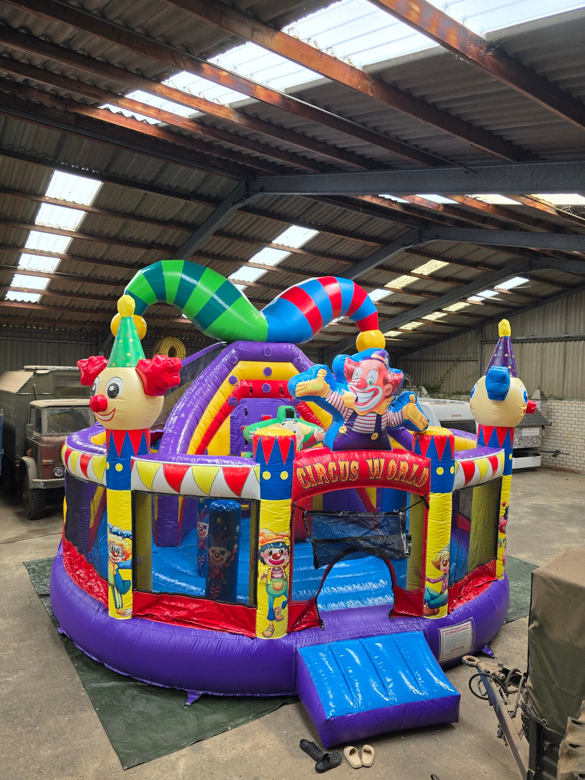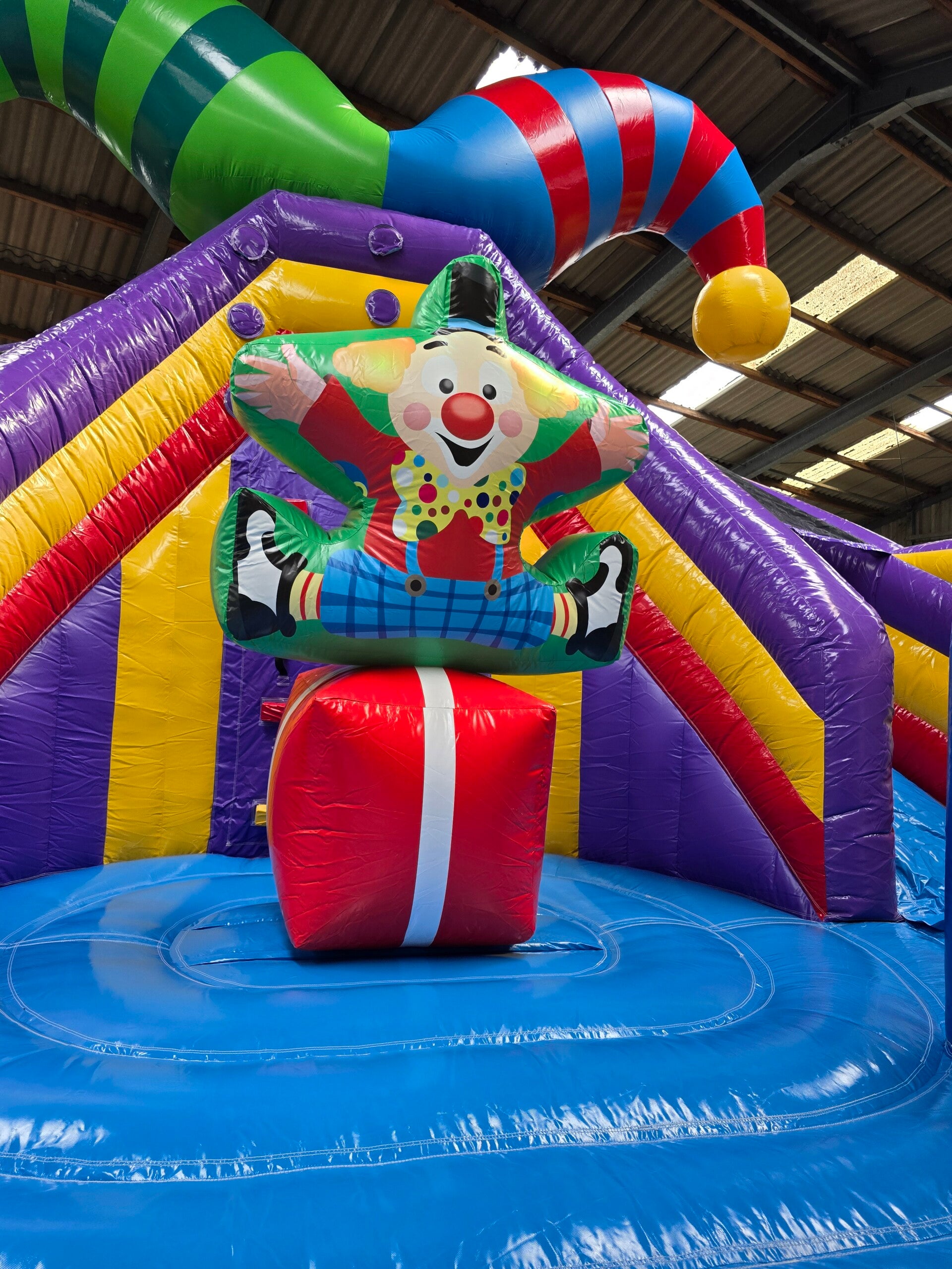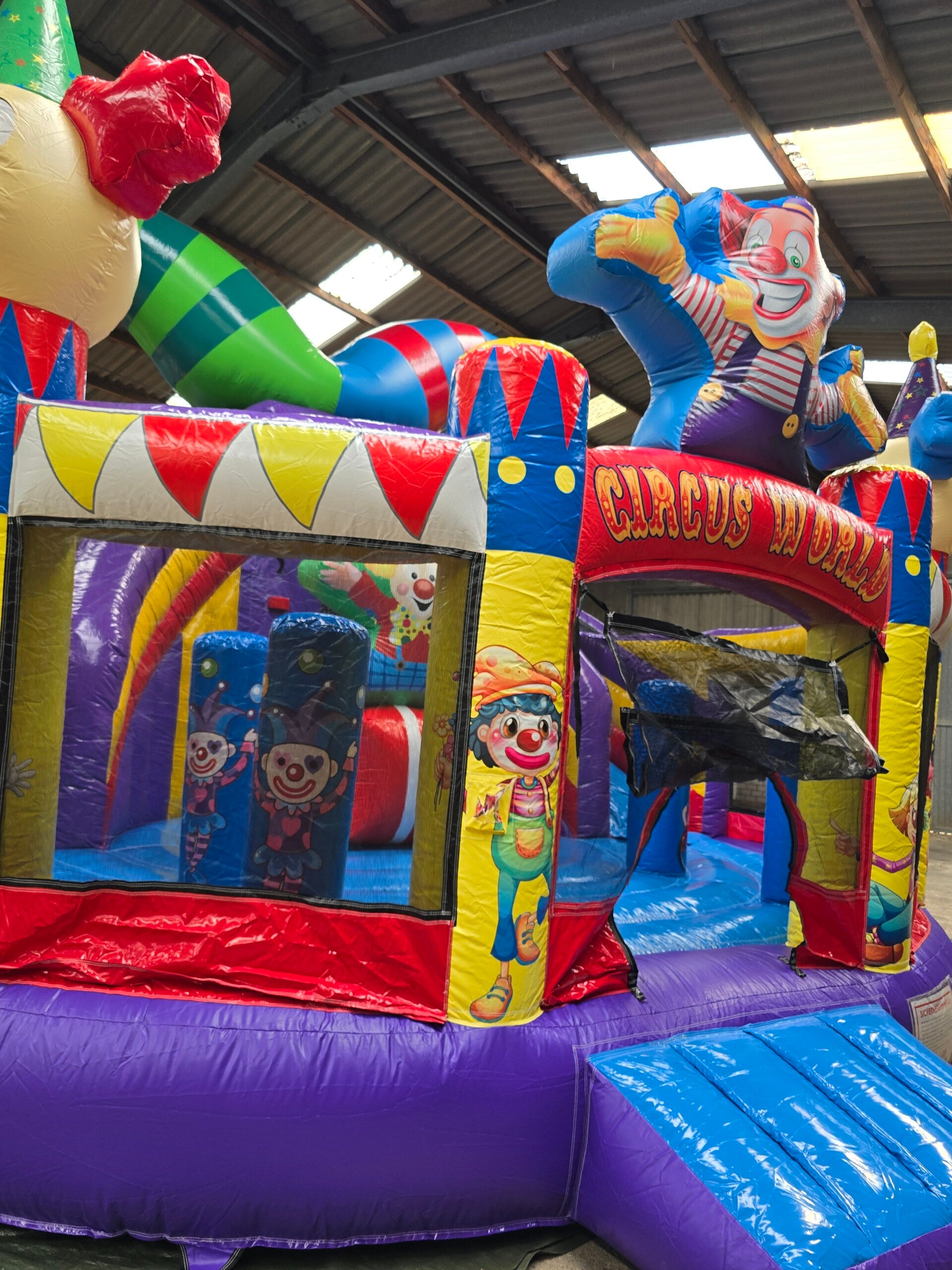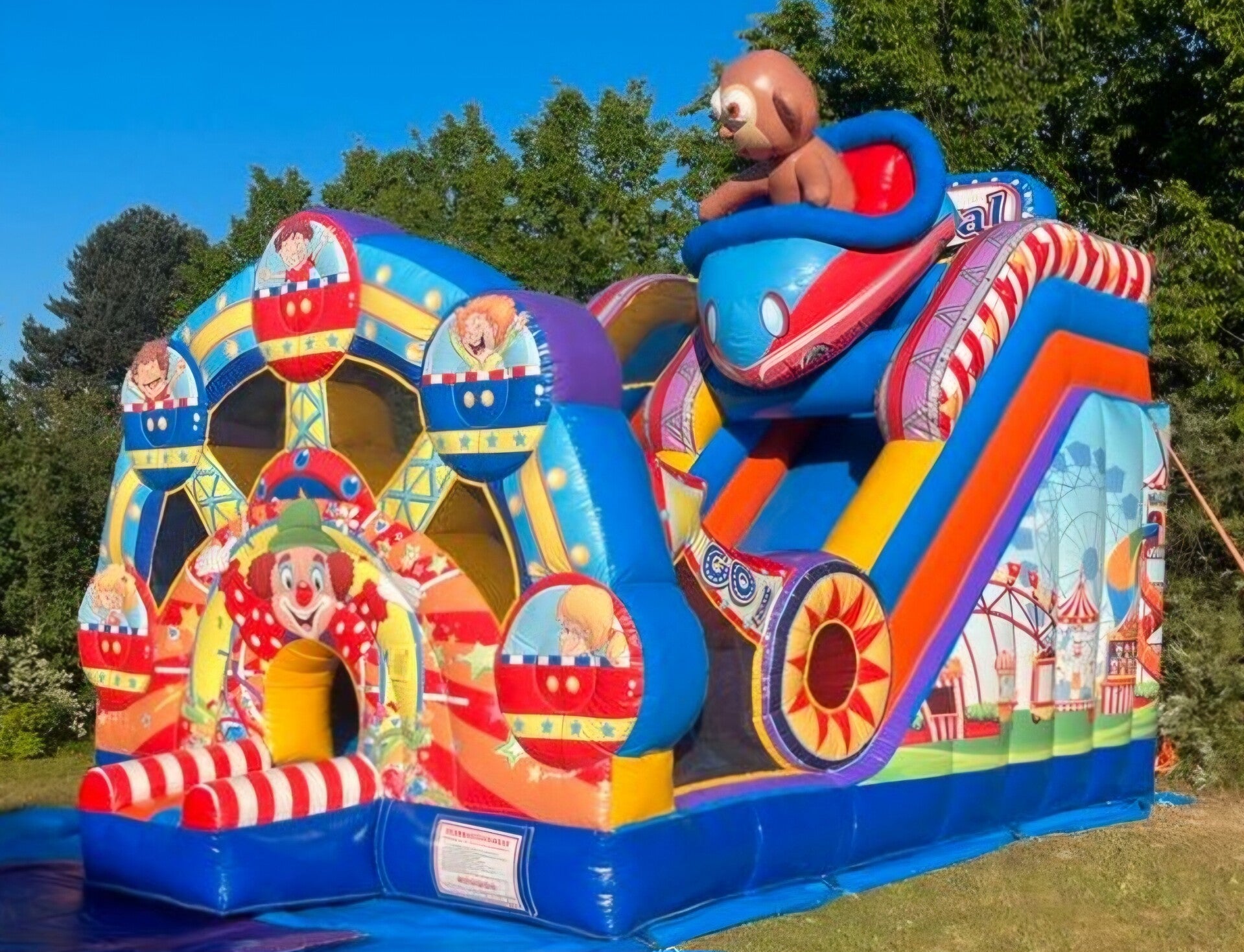 Mit ihrem farbenfrohen Design und liebevoll gestalteten Illustrationen entführt diese Hüpfburg Kinder in eine fantastische Zirkuswelt. Neben einer großen Hüpffläche sorgen integrierte Spielgeräte und eine spannende Kletterwand für abwechslungsreichen Spielspaß. Hier wird jedes Kind zum Star in der Manege!