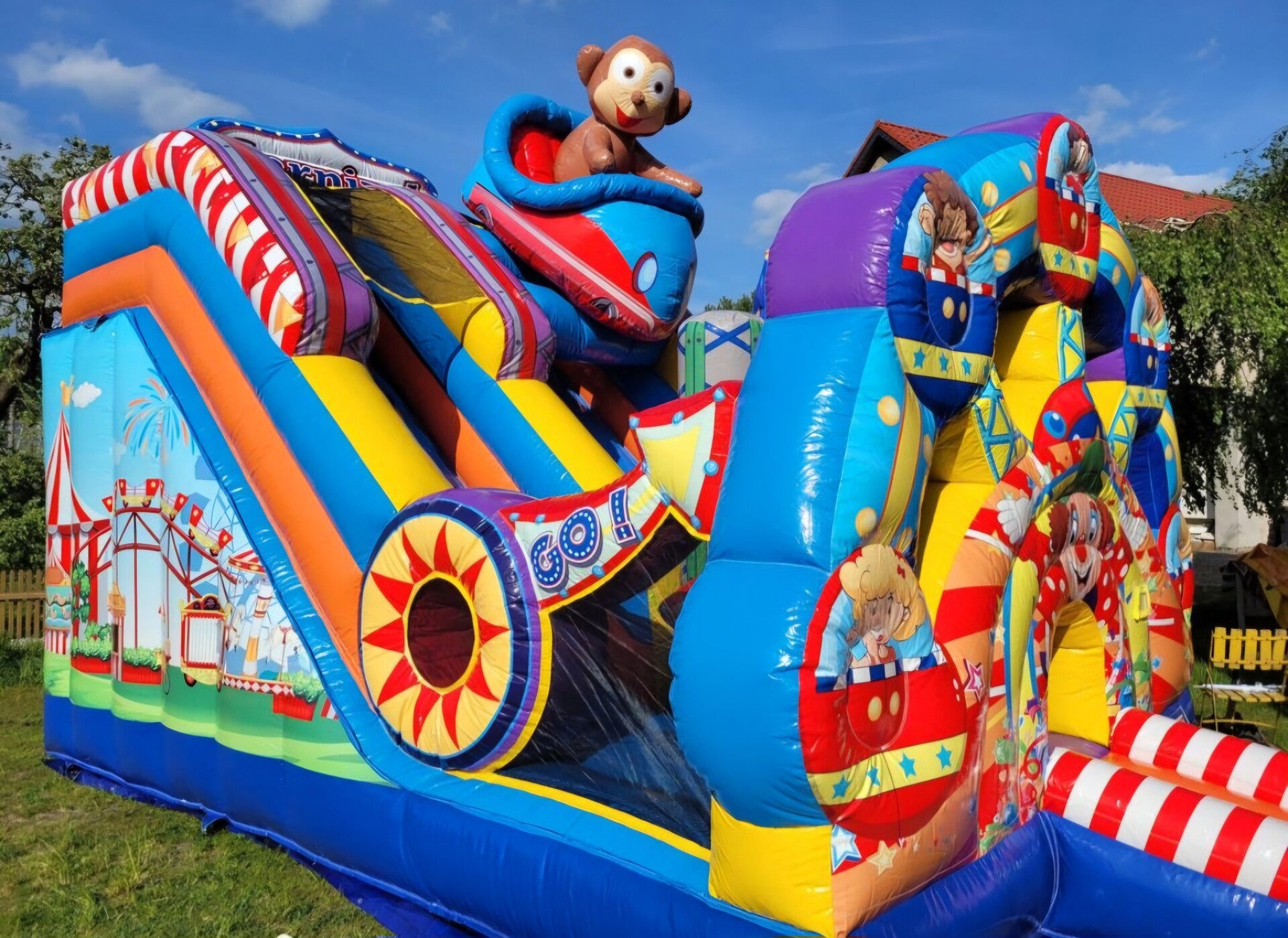 Unsere Hüpfburg Jahrmarkt ist die perfekte Hüpfburg für kleine Jahrmarktfans. Die Hüpfburg bietet den Kindern ein aufregendes Hüpf- und Rutschvergnügen, während das liebevoll gestaltete Autoscooter-Design mit dem fröhlichen Äffchen für zusätzlichen Spaß sorgt. Die Hüpfburg ist vorne komplett geschlossen und die Rutsche überdacht, damit ist die Hüpfburg Jahrmarkt Rutsche besonders sicher gestaltet.
